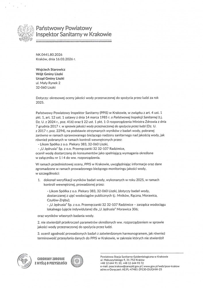 Okresowa ocena jakośći wody przeznaczonej do spożycia przez ludzi za rok 2025.