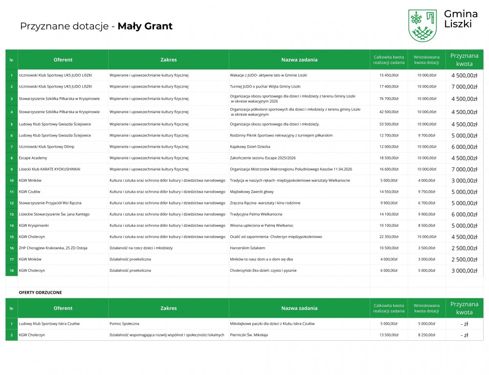Rozstrzygnięcie pierwszego naboru – Małe Granty 2026