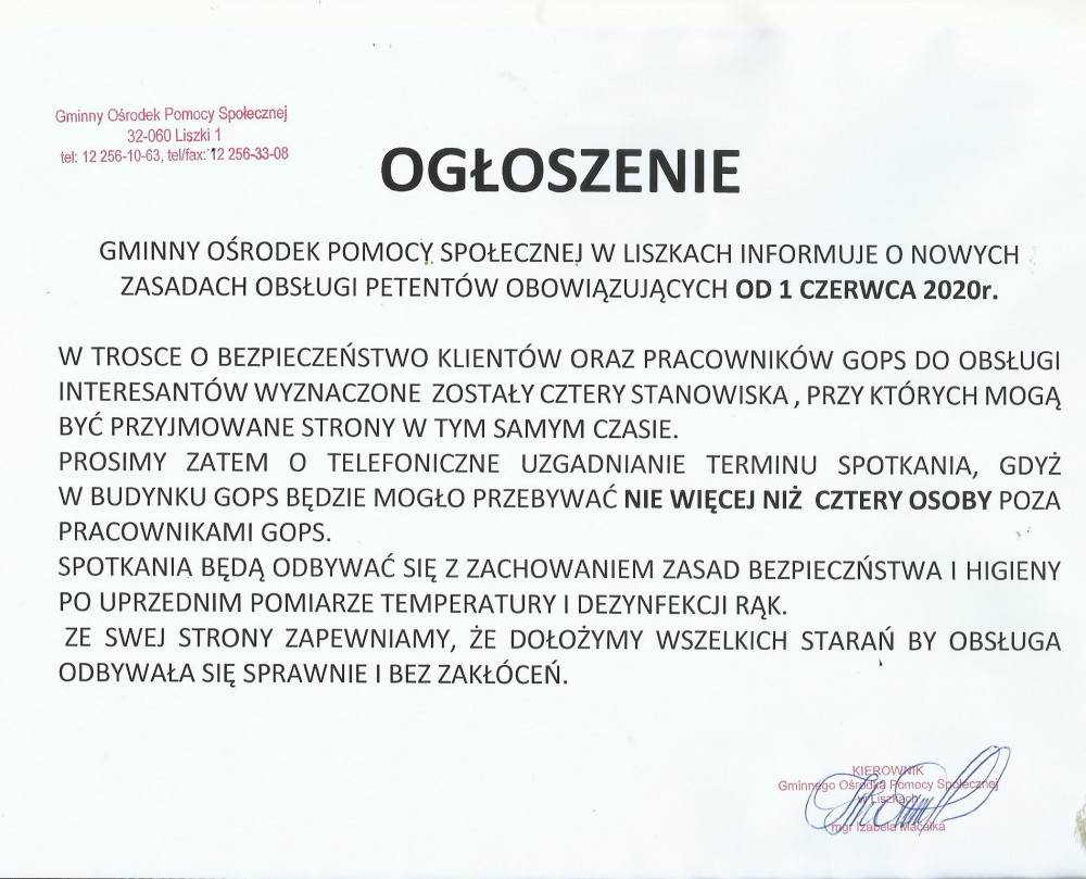 Gminny Ośrodek Pomocy Społecznej w Liszkach informuje o nowych zasadach obsługi petentów obowiązujących od 1 czerwca 2020 r.