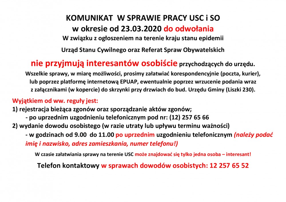 W związku z ogłoszeniem na terenie kraju stanu epidemii Urząd Stanu Cywilnego oraz Referat Spraw Obywatelskich nie przyjmują interesantów osobiście przychodzących do urzędu. Wszelkie sprawy, w miarę możliwości, prosimy załatwiać korespondencyjnie (poczta, kurier), lub poprzez platformę internetową EPUAP, ewentualnie poprzez wrzucenie podania wraz z załącznikami (w kopercie) do skrzynki przy drzwiach do bud. Urzędu Gminy (Liszki 230).
