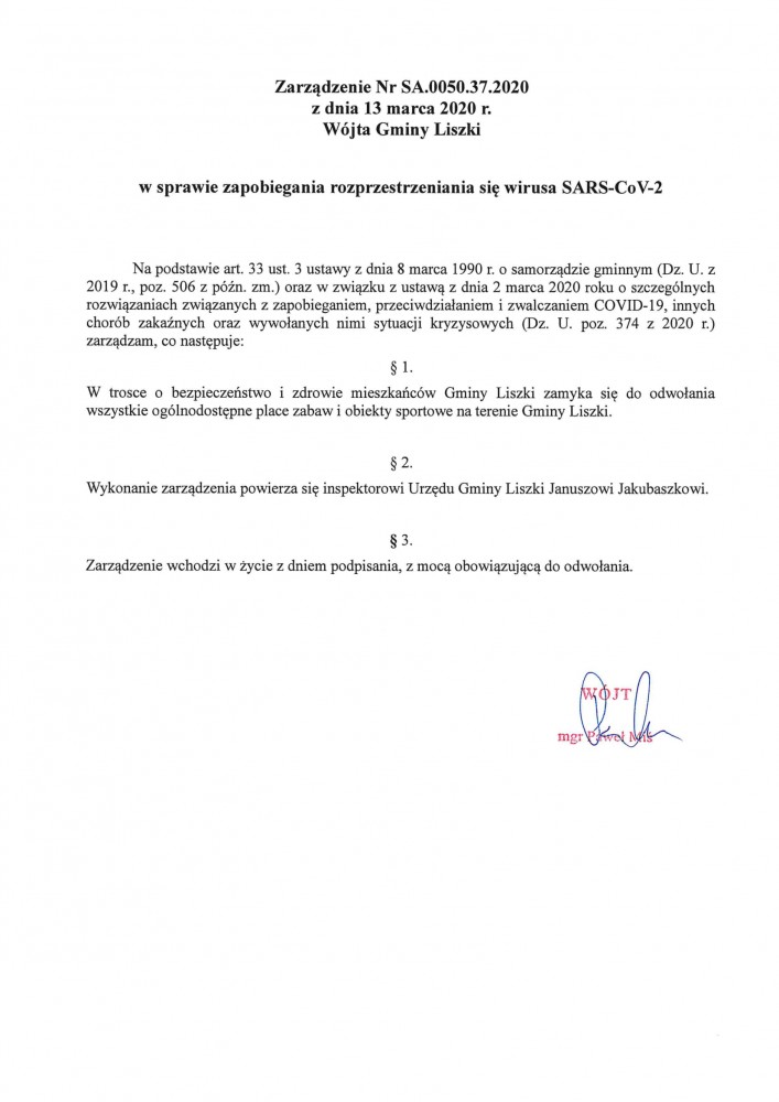 Zarządzenie Wójta Gminy Liszki nr SA.0050.37.2020 z dnia 13 marca 2020 roku.