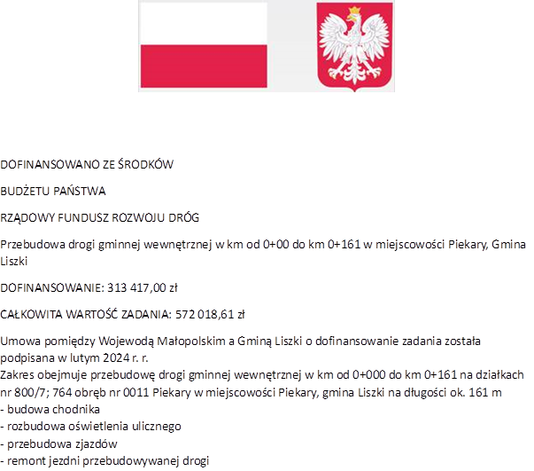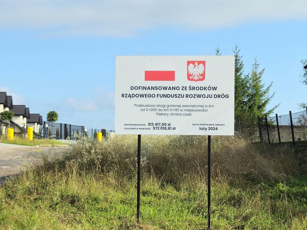 Gmina Liszki otrzymała dofinansowanie z Funduszu Dróg Samorządowych w wysokości 635 563,00 zł na zadanie pn.: "Przebudowa drogi gminnej na odcinku I w kilometrze 0+000,00 - 0+097,96 w miejscowości Piekary i Kryspinów oraz na odcinku II w kilometrze 0+002,75 - 0+284,89 w miejscowości Kryspinów, Gmina Liszki". Całkowita wartość inwestycji to 801 955,08 zł.