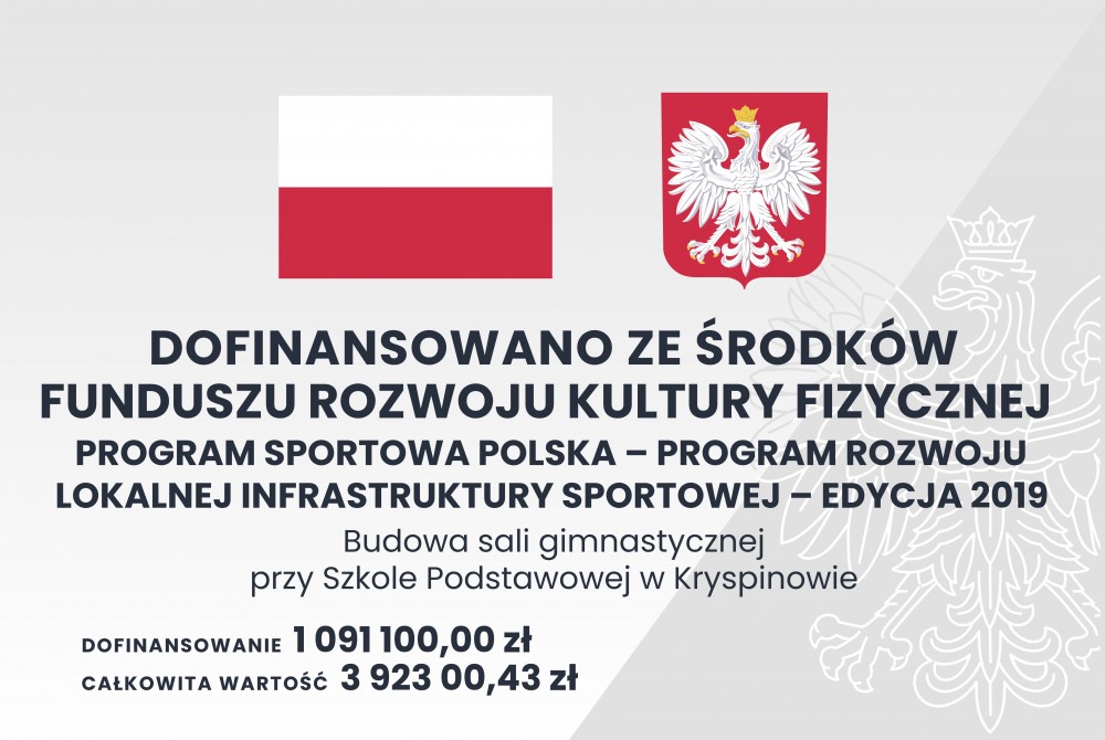 W ramach Programu Sportowa Polska – Program Rozwoju Lokalnej Infrastruktury Sportowej – Edycja 2019 związanego z realizacją zadań inwestycyjnych został złożony wniosek do Ministerstwa Sportu i Turystyki na zadanie „Budowa Sali gimnastycznej przy Szkole Podstawowej w Kryspinowie”.