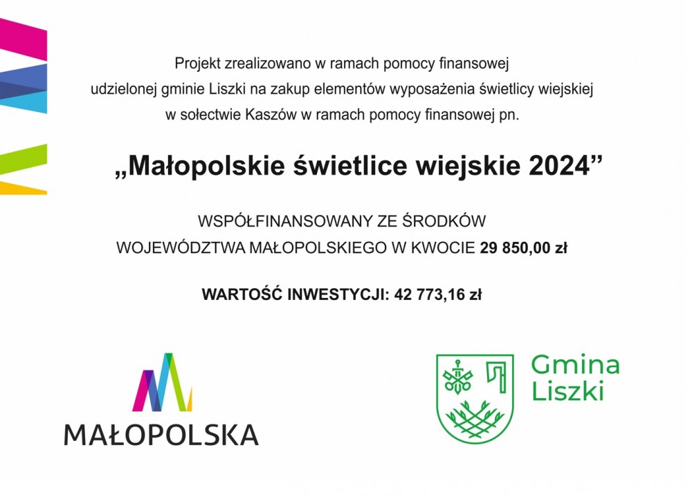 Projekt zrealizowano w ramach pomocy finansowej Urzędu Marszałkowskiego Województwa Małopolskiego pn. "Małopolskie świetlice wiejskie 2024".