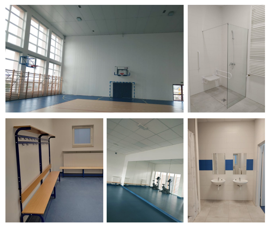 Budynek podzielony będzie na dwie części – część główną, którą stanowić będzie sala gimnastyczna i część towarzyszącą, czyli pomieszczenia szatni dla dziewcząt z zapleczem sanitarnym, szatni dla chłopców z zapleczem sanitarnym, pokój nauczycieli z zapleczem sanitarnym, magazyn sprzętu sportowego, sala do ćwiczeń-siłownia, toaleta dla osób niepełnosprawnych, korytarz, portiernia, pomieszczenia gospodarcze, pomieszczenia techniczne.
